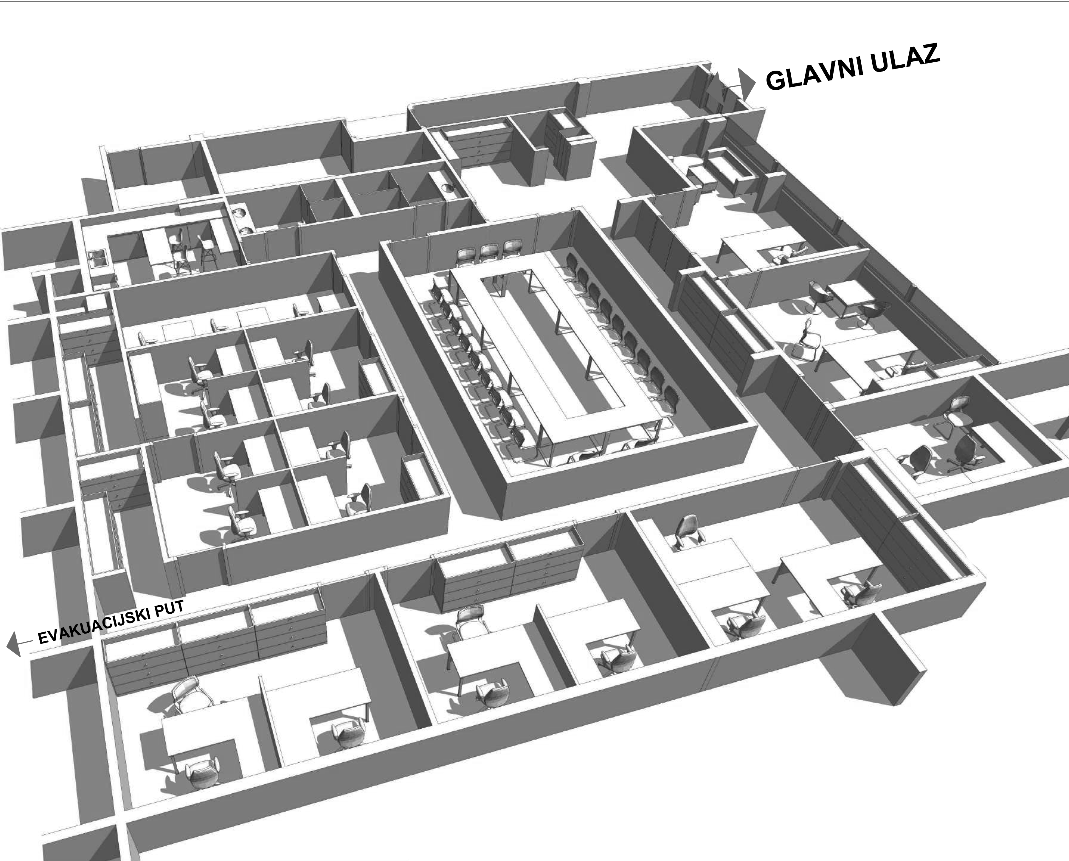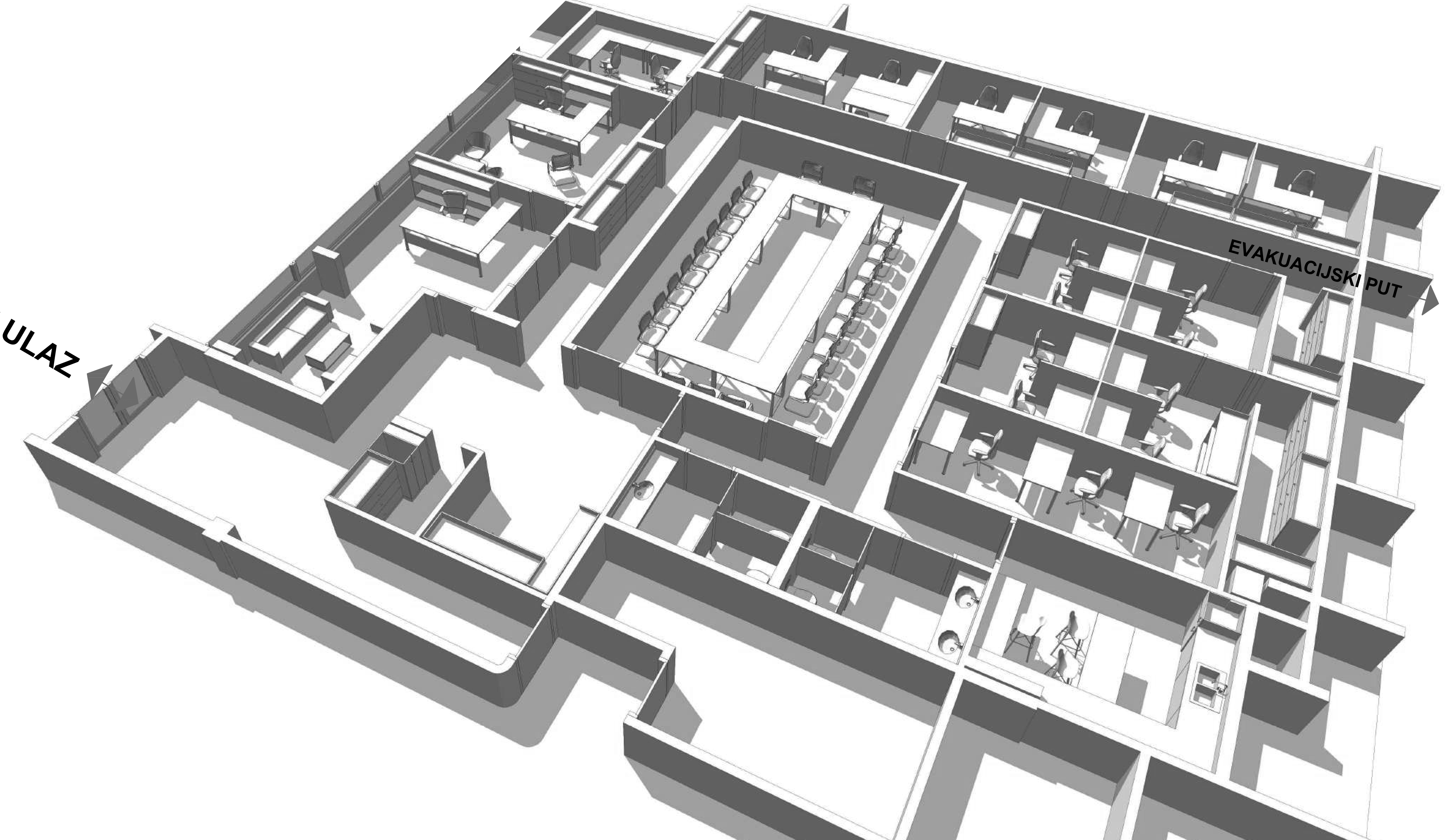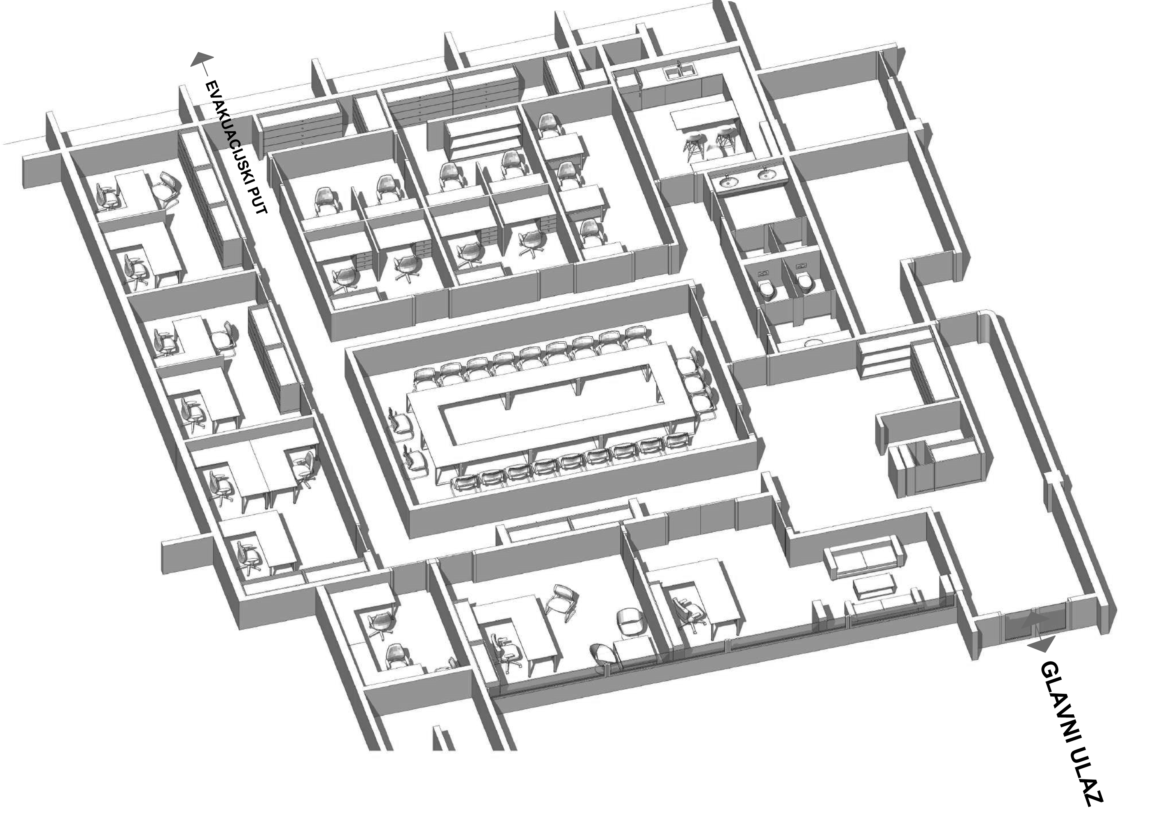 Vizija Radnog Okruženja: Napravili smo idejno rješenje sa 3D prikazima koje možete vidjeti. Predvidjeli smo 2 kancelarije za rukovodeće menadžere, veliku salu za sastanke, 7 kancelarija za dvije osobe, 2 kancelarije za tri osobe, server sobu, ostavu za kancelarijski materijal, kuhinju, toalete, garderobu, recepciju i čekaonicu.