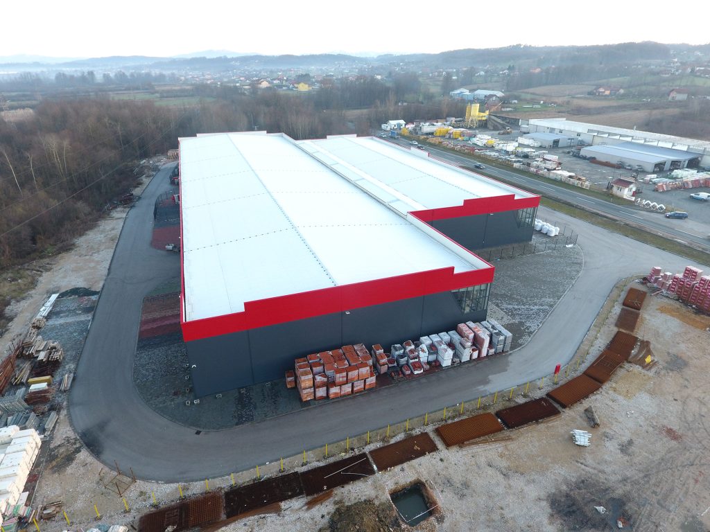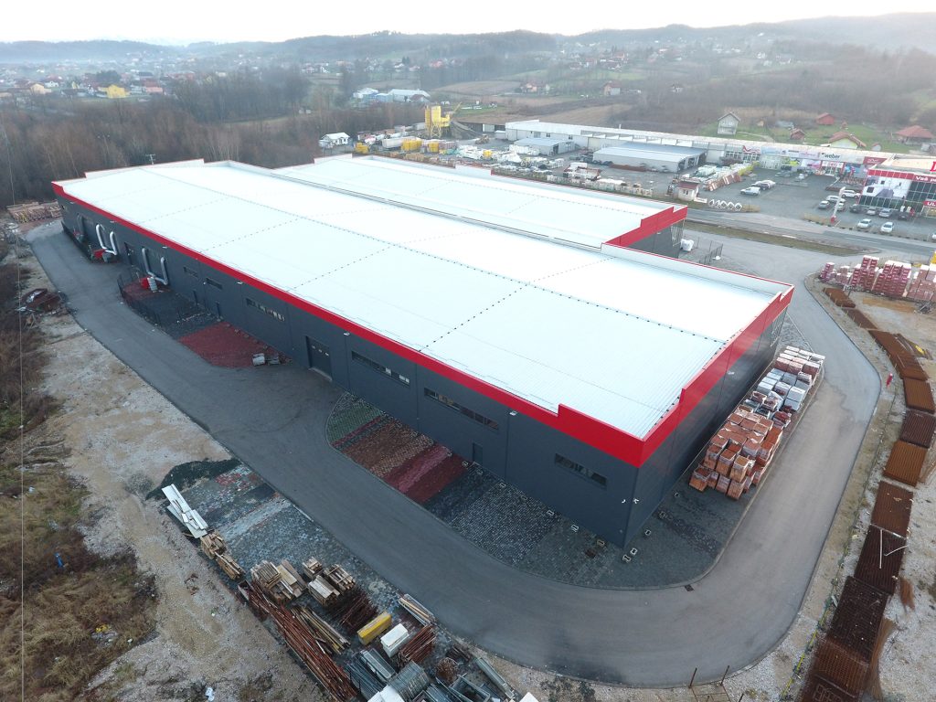 FASADA: termoizolacioni zidni paneli - antracit i crvena kombinacija, sa fasadnom aluminijskom stolarijom na ivicama objekta. Objekat posjeduje rolo vrata dimenzija 4m x 4m, kao i ulazna.